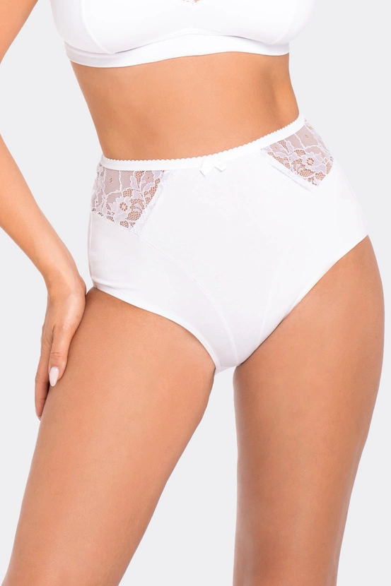 Figi z wysokim stanem o klasycznym kroju, wykonane z najwyższej jakości, delikatnej bawełny, która zapewnia najwyższy komfort podczas noszenia. Z przodu, po obu stronach subtelna wstawka z delikatnej koronki, tył gładki.