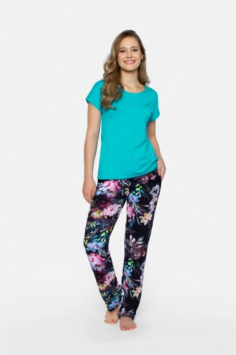 Flora to piżama z prostą bluzką z krótkimi rękawkami i długimi spodniami.