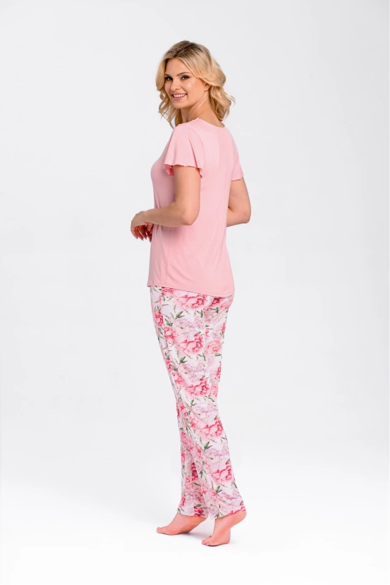 Zanurz się w komforcie dzięki naszej pięknej piżamie Tiffany z wiskozy, składającej się z uroczej różowej koszulki i długich spodni z kwiatowym nadrukiem.