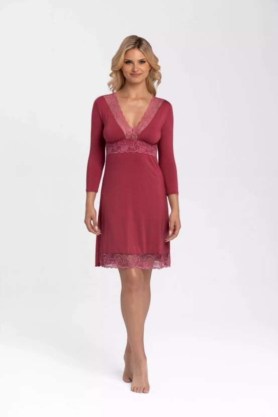 THELMA to koszula nocna, która dzięki rękawkowi ¾ przypadnie do gustu zarówno wielbicielkom krótszych jak i dłuższych rękawów. Delikatna koronka podkreśla dekolt oraz wykańcza dolną część koszuli. Dzięki gumce zamieszczonej pod biustem, sprawdzi się także dla kobiet z większym rozmiarem. Kolor różowy w jasnym odcieniu idealne sprawdzi się na na wiosenne i letnie wieczory.
