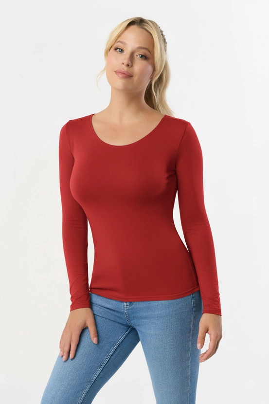 - Bluzka z długim rękawem i okrągłym dekoltem z miękkiej dzianiny wiskozowej. Wygodna, elastyczna i idealna na co dzień.
