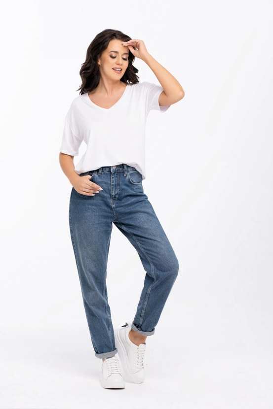 - Luźny t-shirt z dekoltem w serek z miękkiej dzianiny. Lekki, oddychający i wygodny – idealny na co dzień i do casualowych stylizacji.